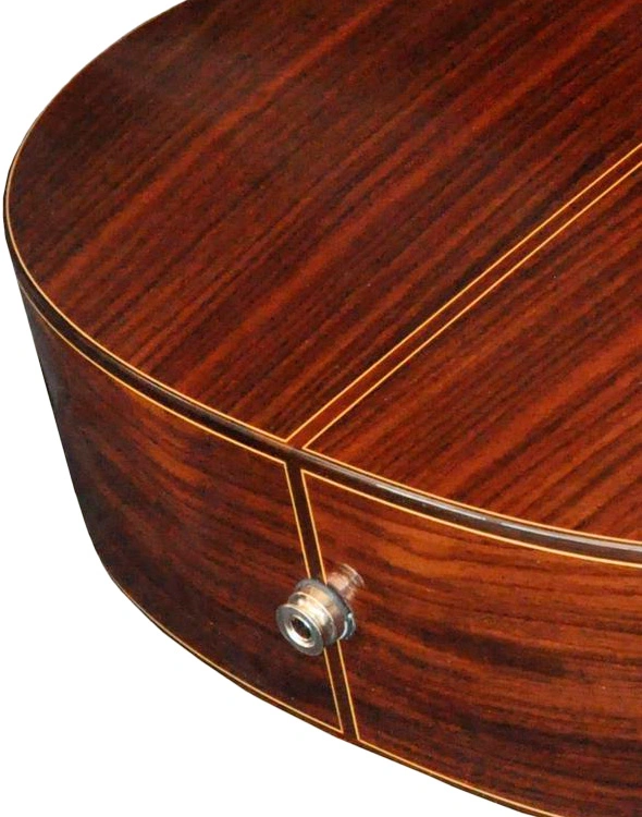 Esta guitarra clásica electroacústica Camps 2000 Fishman Flex-BL cuenta con tapa maciza de abeto alemán (o spruce sólido), aros y fondo de palosanto de India macizo, mástil de cedro con refuerzo y varilla regulable bidireccional para ergonomía óptima, diapasón de ébano, puente de palisandro y escala de 650 mm. Barniz brillante resalta su acabado artesanal, con cejuelas de hueso (52 mm en pala, 58 mm entre 1ª y 6ª cuerda) y cutaway para acceso fluido a los agudos; el sistema Fishman Flex BL usa puente de seis contactos independientes para equilibrio perfecto de cuerdas.