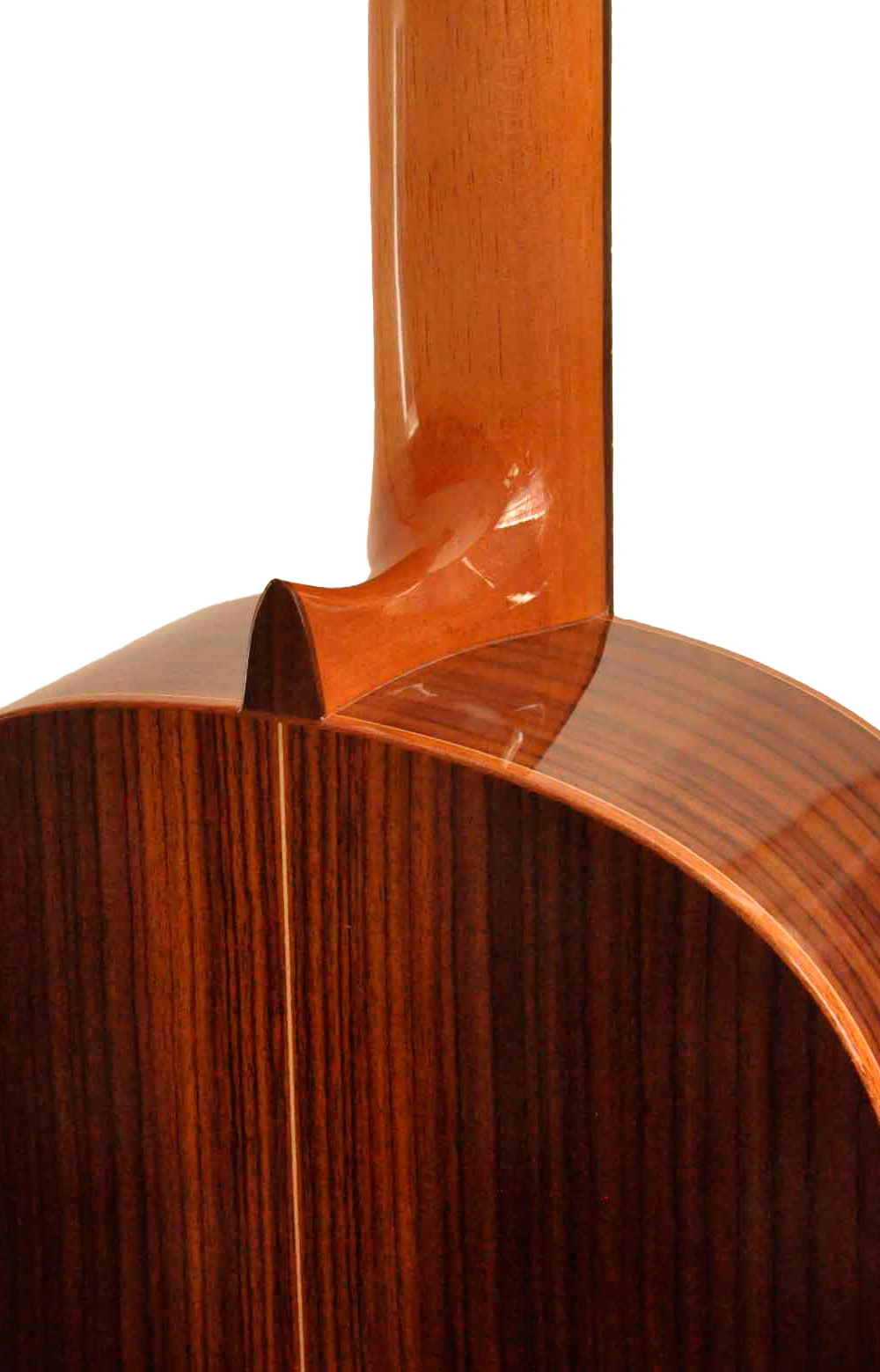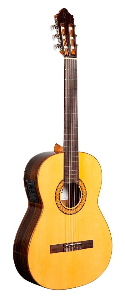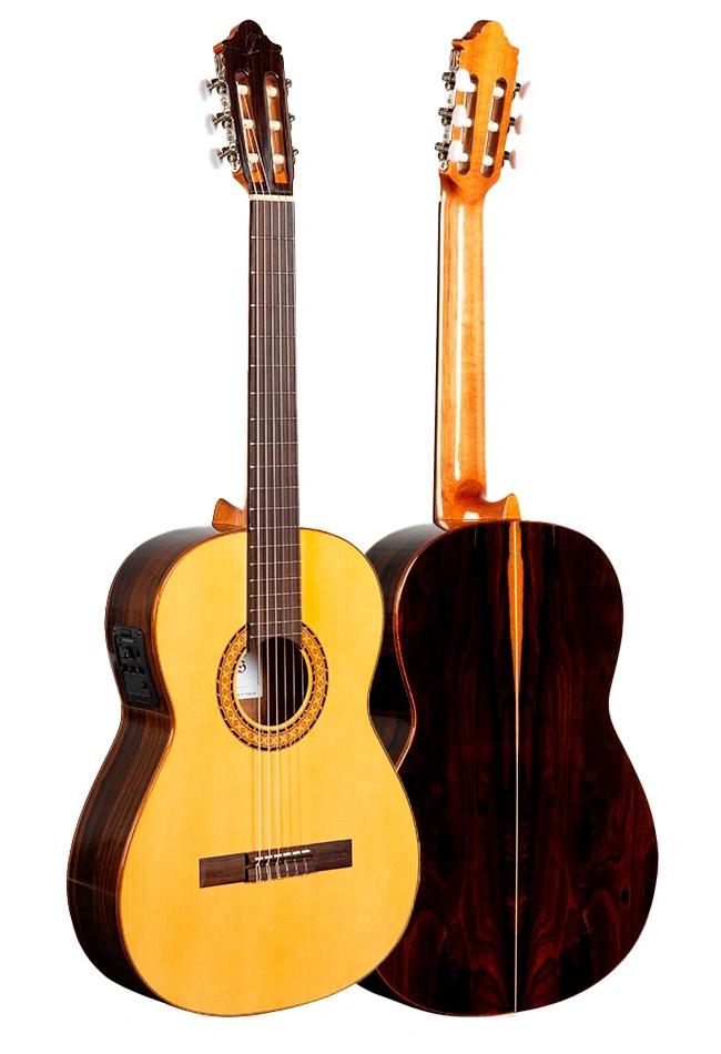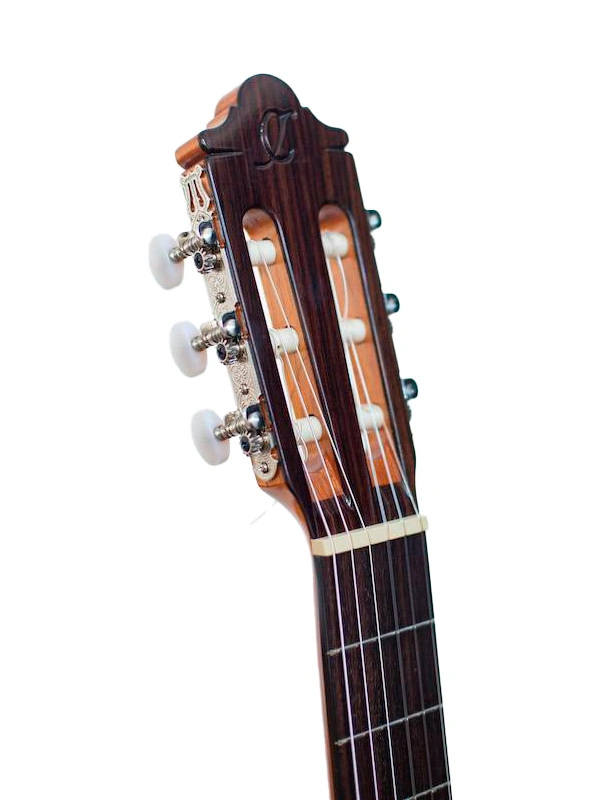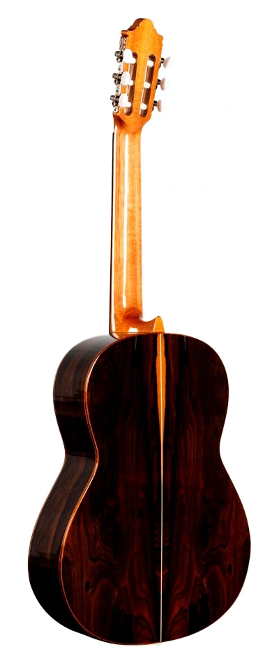Su timbre clásico ofrece calidez penetrante y volumen equilibrado, con resonancia rica del abeto que evoca profundidad tonal y proyección natural, ideal para sonido cálido y sustain prolongado. La combinación ziricote-abeto entrega riqueza armónica, transparencia y respuesta inmediata, capturando texturas sutiles en cada nota con ergonomía ligera que invita a horas de interpretación íntima.