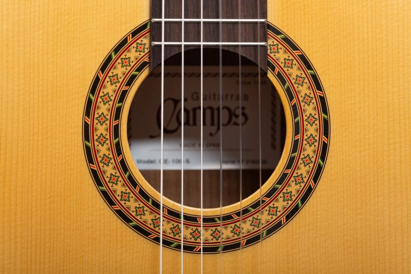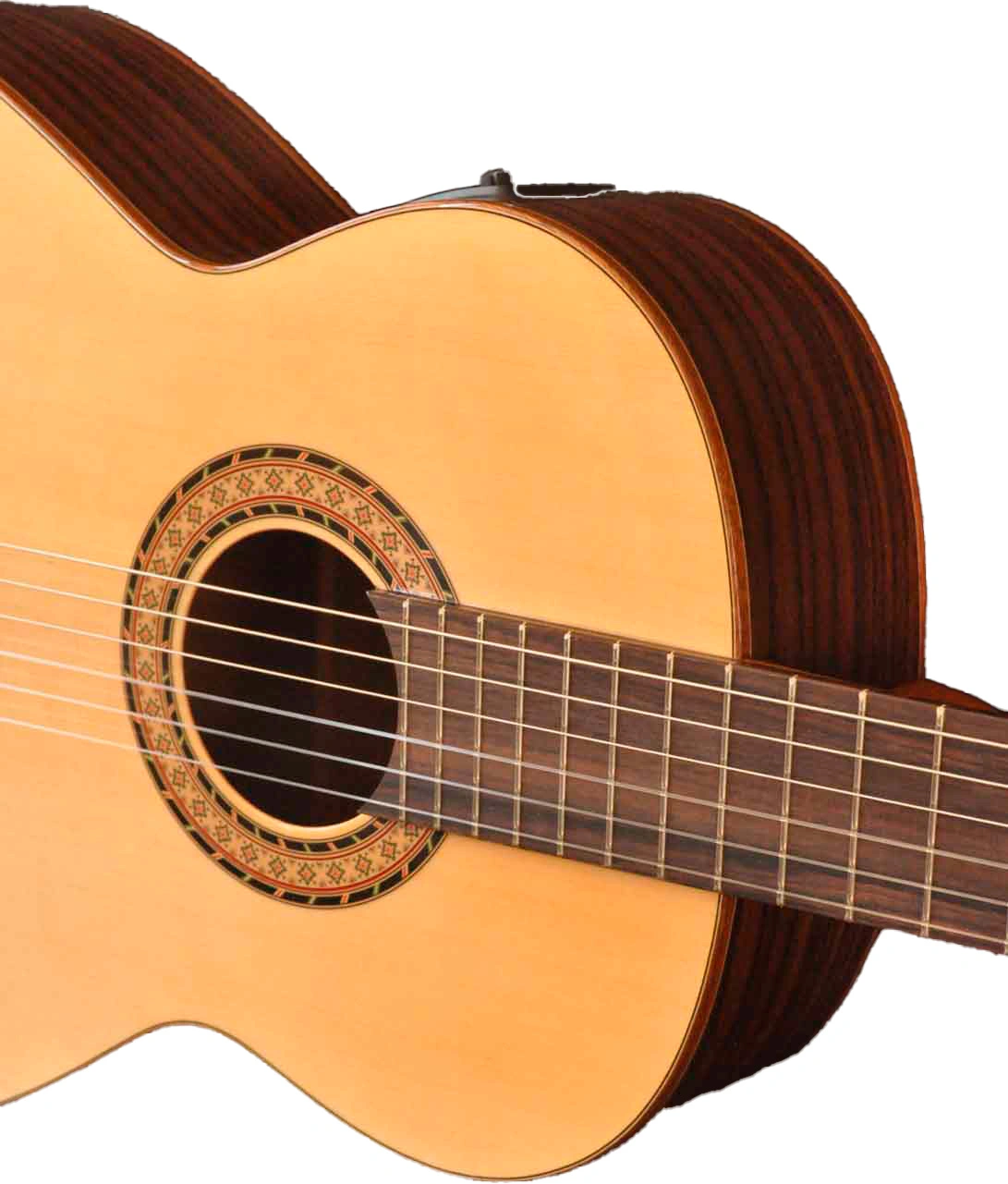 La Camps CE-100 Abeto cuenta con tapa maciza de abeto (spruce) cuidadosamente seleccionada, aros y fondo de ziricote exótico, mástil de cedro con varilla regulable bidireccional para máxima estabilidad, y diapasón y puente de palisandro. Acabado en barniz brillante con filetes de caoba, cejuela de 52 mm, tiro de 650 mm y preamplificador Fishman Classic III con seis cejuelas independientes para equilibrio perfecto de cuerdas. Hecha en España, esta guitarra profesional de concierto incorpora cejuela de hueso en el puente, garantizando acústica natural y respuesta precisa.