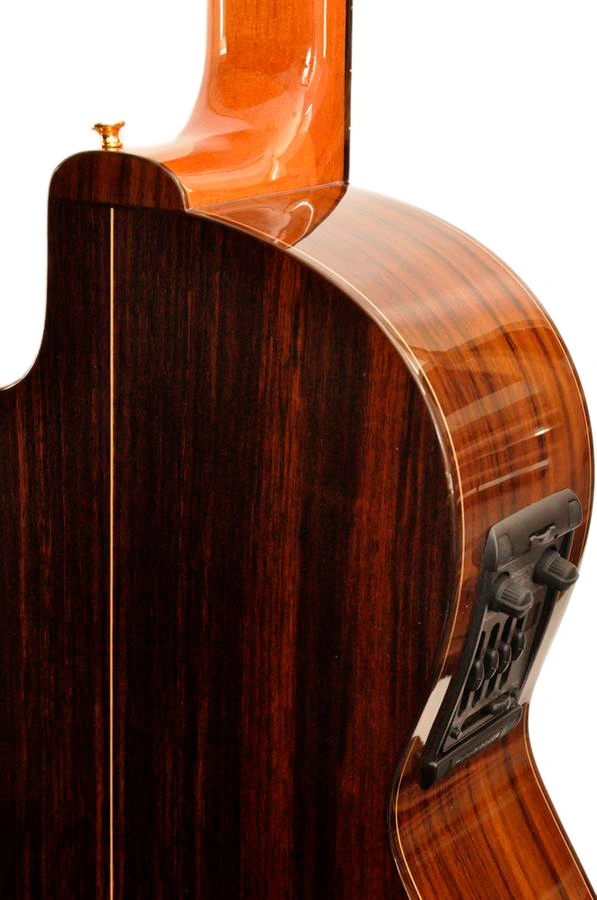 Tapa sólida de cedro canadiense, aros y fondo de palosanto de India, mástil de cedro con varilla bidireccional ajustable para ergonomía óptima, diapasón de ébano y puente de palisandro, cejuela de 52 mm y escala de 650 mm. Barniz brillante que realza su acústica natural, con preamplificador Fishman Prefix Plus-T y seis cejuelas independientes para balance perfecto. Cutaway ergonómico invita a una pulsación fluida, ideal para guitarra profesional.