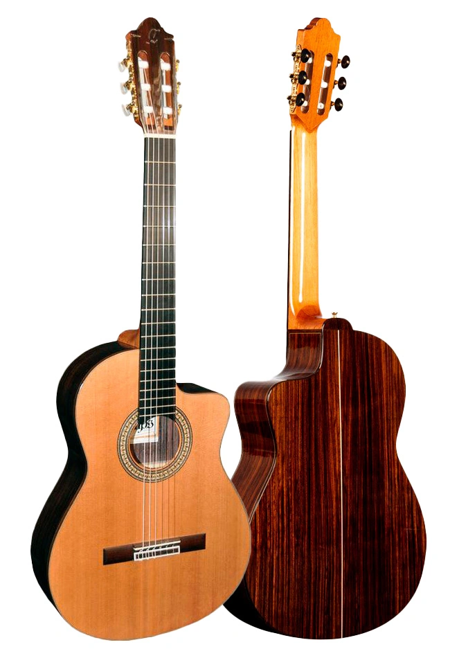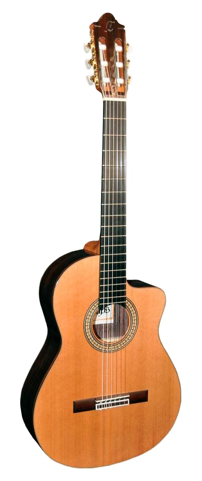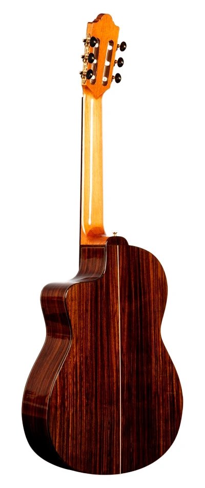 La Camps MC-6 Cutaway presenta tapa maciza de cedro canadiense, aros y fondo de palosanto de India, mástil de cedro, puente de palisandro y diapasón de ébano. Incorpora varilla regulable en el mástil para ergonomía óptima (cejilla 52 mm, separación 1ª-6ª 58 mm, tiro 650 mm), acción baja facilitando la pulsación, y acabado brillante que resalta su acústica natural.