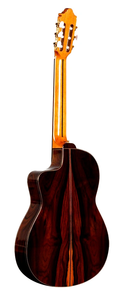 La Camps NAC 4 Abeto destaca por su tapa armónica de abeto alemán macizo (spruce sólido), seleccionada por su rigidez y vibración uniforme, combinada con aros y fondo de ziricote refinado, una madera exótica densa que aporta estabilidad y calidez. El mástil es de cedro canadiense con varilla regulable bidireccional para ajuste perfecto, diapasón y puente en ébano y palisandro, cejuela de hueso de 52 mm y separación entre 1ª-6ª de 58 mm. Su barniz brillante realza la caja estrecha (profundidad 62-67 mm) con cutaway estrecho para acceso total al diapasón, tiro de 650 mm y preamplificador Fishman Pro-Blend con seis cejuelas independientes, permitiendo un balance tonal versátil en vivo o estudio.