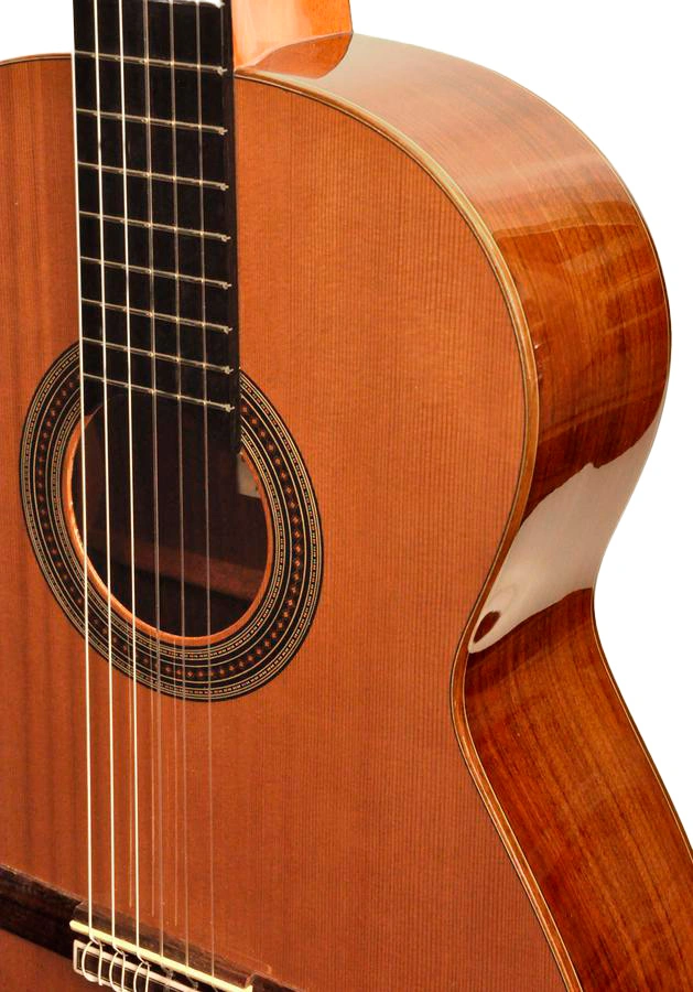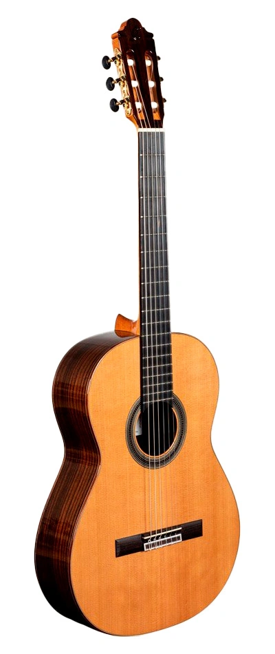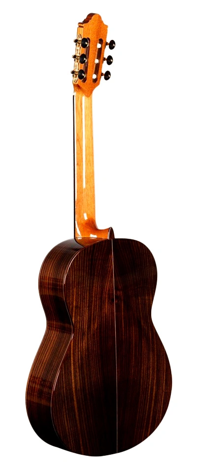 Su timbre cálido y potente evoca la esencia de la guitarra clásica española hecha en España, con resonancia profunda, riqueza armónica y proyección equilibrada que llena cualquier espacio íntimo. El cedro aporta sustain sedoso y transparencia en medios, mientras el palosanto infunde graves profundos y agudos cristalinos, ofreciendo una experiencia táctil ergonómica y sonora envolvente para horas de interpretación apasionada.