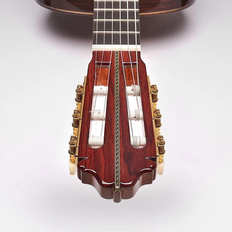La guitarra clásica Esteve Aniversario se construye con tapa maciza de cedro canadiense o abeto alemán, seleccionados por su alta respuesta dinámica y riqueza armónica. Fondo y aros de cocobolo macizo aportan una densidad cercana al palosanto de India, pero con un carácter aún más incisivo y definido en el registro grave. El mástil de cedro con refuerzo de fibra de carbono y diapasón de ébano garantizan estabilidad, precisión y una sensación táctil firme bajo los dedos. El barniz de acabado nitrocelulósico realza las vetas y permite que la tapa vibre libremente, apoyado en un sistema de doble tapa desarrollado por Adalid para mejorar volumen y proyección equilibrada.