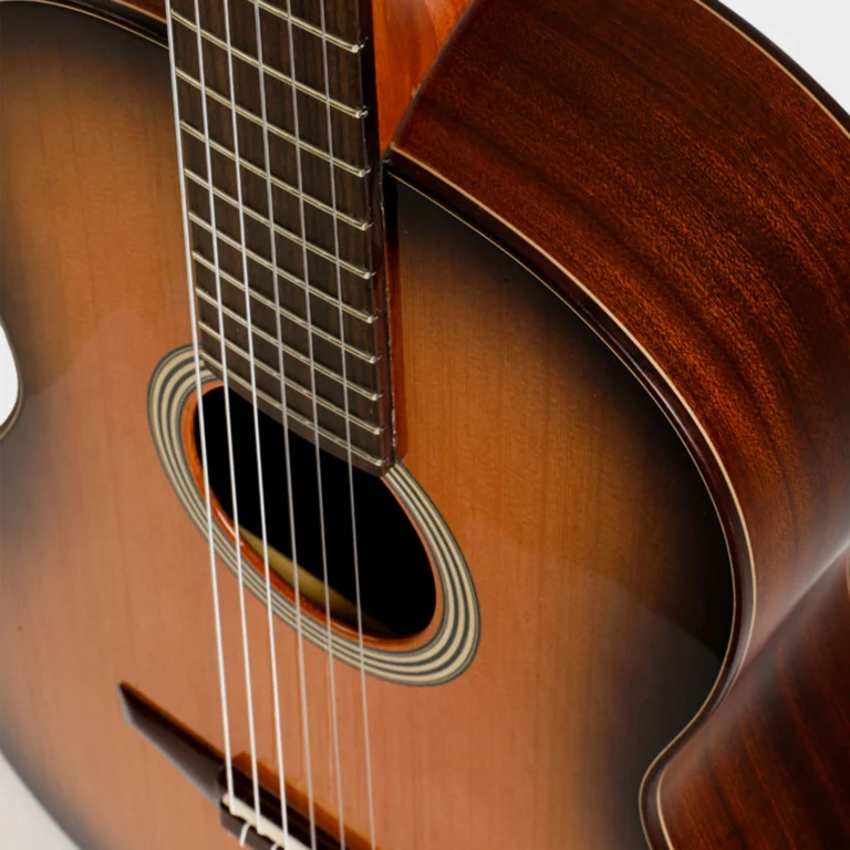Su construcción destaca por la tapa sólida de cedro con barniz brillante de poliuretano, aros de sapele sólido satinado y fondo laminado de palosanto de India, mástil de caoba africana con truss rod y cejuela de 48 mm para mayor comodidad, diapasón curvo de 16” en palosanto de India y escala de 650 mm; estos materiales verificados aseguran durabilidad y ergonomía ideal para manos habituadas a acústicas o eléctricas.