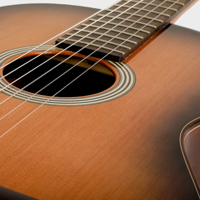 El sonido ofrece un ataque cálido y respuesta inmediata del cedro, con riqueza armónica, sustain generoso y proyección equilibrada gracias al sapele y palosanto; su acústica natural evoca profundidad tonal y transparencia, perfecto para explorar resonancias íntimas en casa con textura sensorial envolvente.