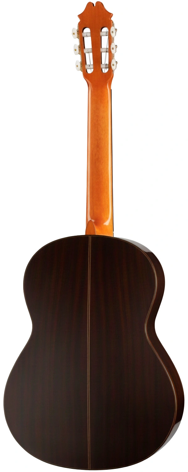 Disponible con tapa de cedro canadiense macizo (Thuja Plicata) o abeto alemán selecto (Picea Abies), fondo y aros de palosanto de India sólido (Dalbergia latifolia) que aportan calidez y estabilidad, mástil de samanguila (Khaya ivorensis) para ergonomía óptima, y diapasón de ébano (Diospyros Crassiflora) con escala de 650 mm y cejuela de 51-52 mm. Incluye clavijeros Schaller dorados de precisión, puente artesanal de palosanto tallado a mano para óptima transmisión vibracional, y barniz de poliuretano que preserva la vibración natural, todo en construcción 100% manual.
