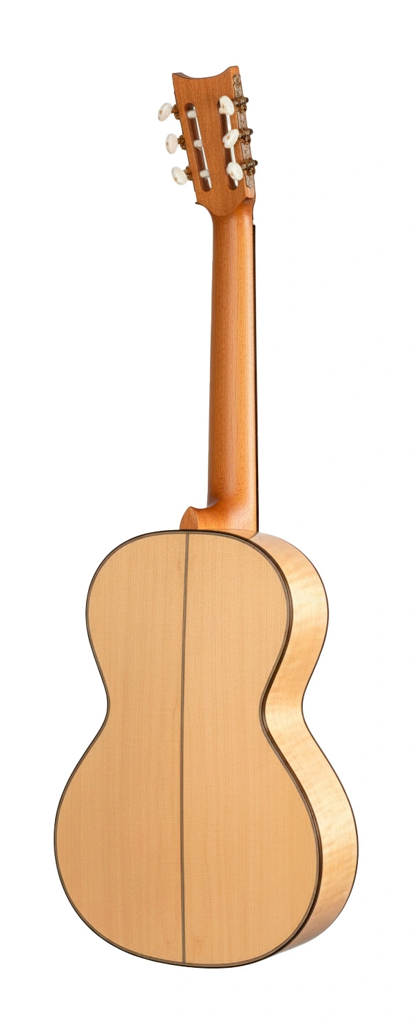 El modelo Romántica presenta una tapa de abeto alemán (Picea abies) macizo, con fondo y aros de arce (Acer pseudoplatanus) policromado, que aporta definición y un ligero carácter brillante al sonido. El mástil es de cedro (Cedrela odorata), con diapasón de ébano, y una escala de 630 mm y cejuela de 48 mm, con un perfil de caña cómodo y accesible. El instrumento se termina con barniz especial a mano, y conserva un espíritu de construcción clásica romántica actualizada, con un diseño generoso en el mástil.