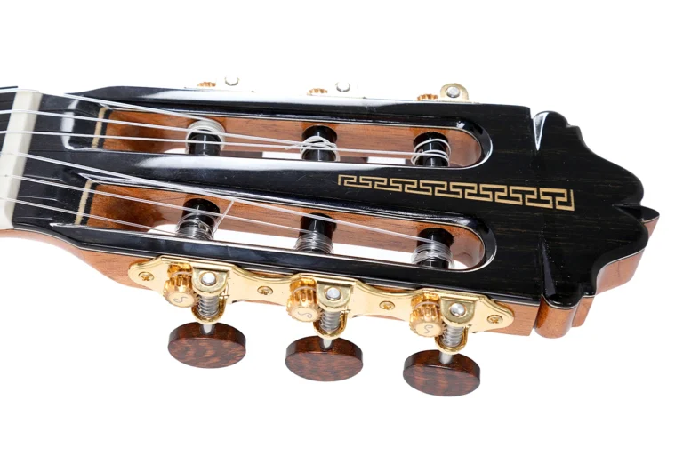 Monta doble tapa de abeto con Nomex, una solución que favorece una vibración muy libre y eficaz; incorpora además doble fondo y doble aro de ziricote y ciprés, mástil de cedro, diapasón de ébano, escala de 650 mm, cejuela de 51 mm, 20 trastes y acabado en laca nitrocelulósica natural.
