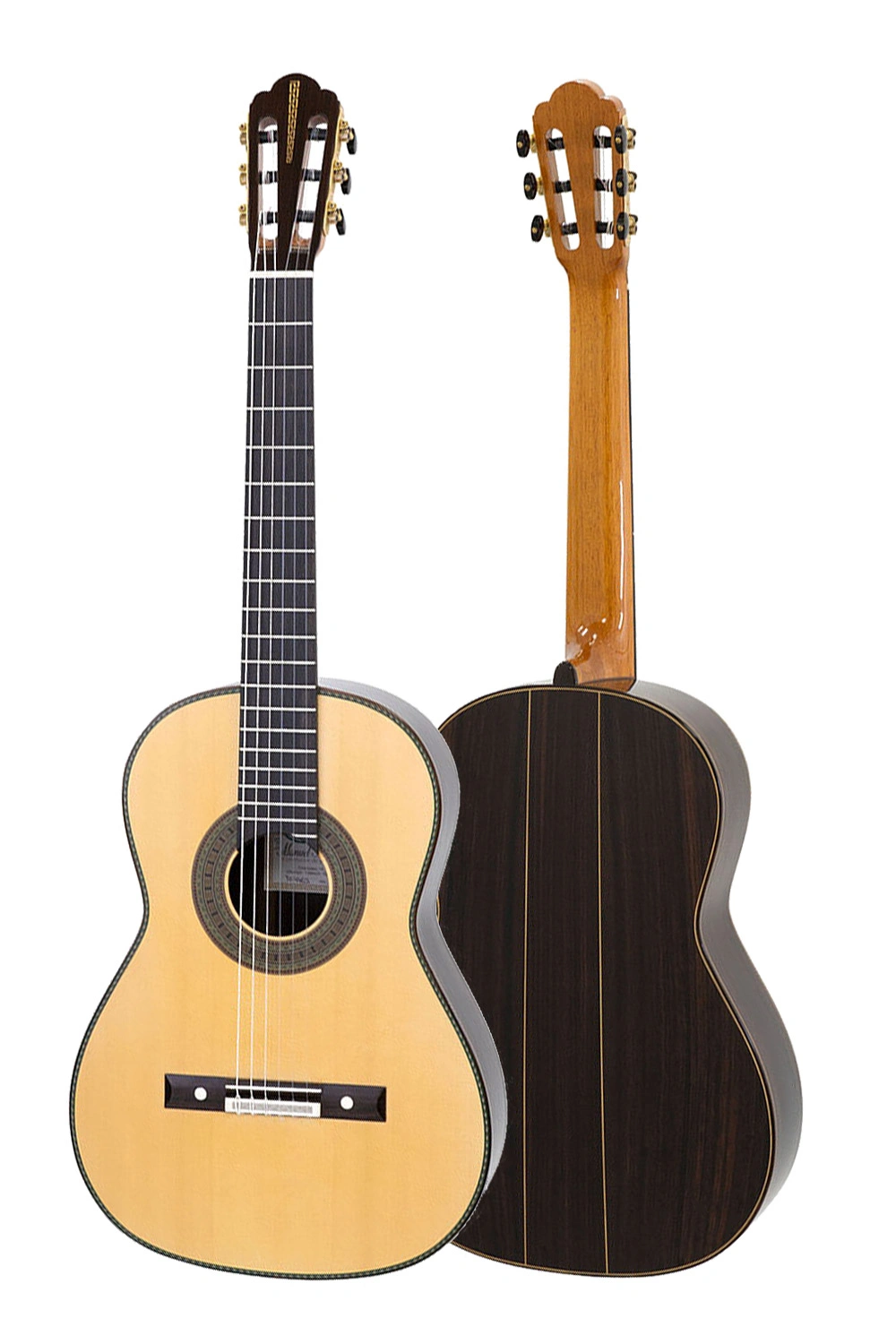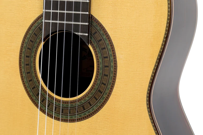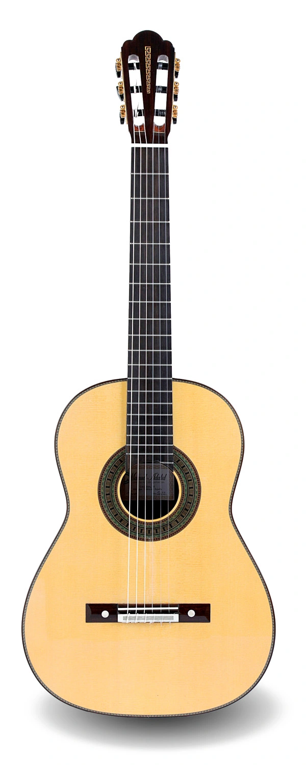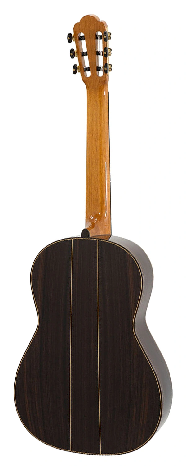 Despliega un sonido cálido y envolvente, con un sustain amplio que sostiene cada nota en el espacio, proyección equilibrada entre registros y una riqueza armónica que evoca la profundidad tonal de las grandes guitarras españolas. Los agudos cristalinos del abeto alemán se entrelazan con graves redondos y aterciopelados del palosanto, ofreciendo una respuesta inmediata, transparencia sublime y una textura sonora madura que revela matices sutiles en cada interpretación.