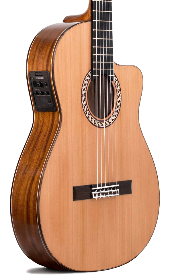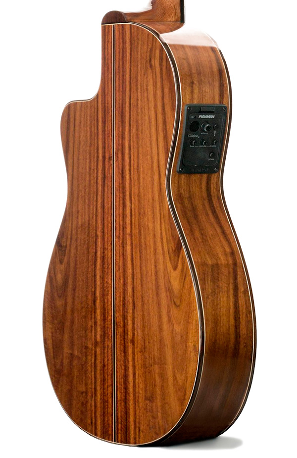 A pesar de su caja estrecha, esta guitarra clásica ofrece una resonancia sorprendentemente amplia, con graves redondos, medios presentes y agudos claros, manteniendo una proyección equilibrada muy cómoda de controlar en casa, en ensayo o en pequeño escenario. El cedro aporta un sonido cálido y una respuesta inmediata al ataque, mientras el palosanto de India contribuye a la profundidad tonal y a la riqueza armónica, dando como resultado una guitarra española versátil, apta tanto para repertorio de guitarra clásica como para un toque cercano a la guitarra flamenca moderna. Conectada, el previo Fishman preserva la transparencia y el sustain natural del instrumento de concierto, permitiendo matizar desde un pianissimo íntimo hasta pasajes más dinámicos sin perder definición.