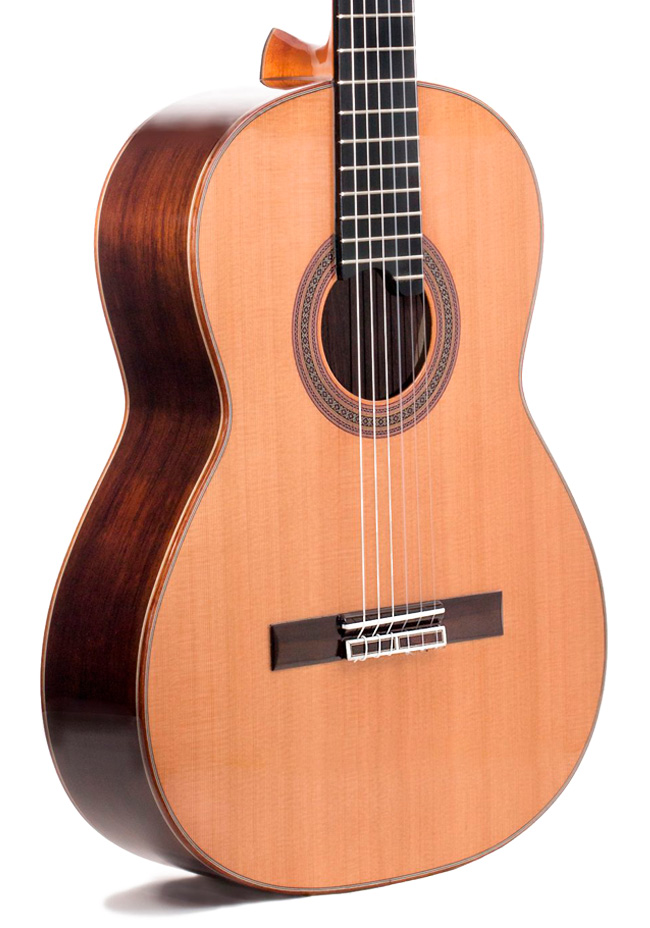 La Prudencio Saez 6-PS se construye con tapa maciza de cedro canadiense o abeto alemán en configuración Lattice System, que optimiza la resonancia y la respuesta inmediata del instrumento. Fondo y aros son de palosanto de Madagascar macizo, mástil de cedro, diapasón de ébano con refuerzo de fibra y puente de palosanto, rematados con barniz a brillo mediante laca de resina natural, tiro de 650 mm y cejuela de 52 mm.