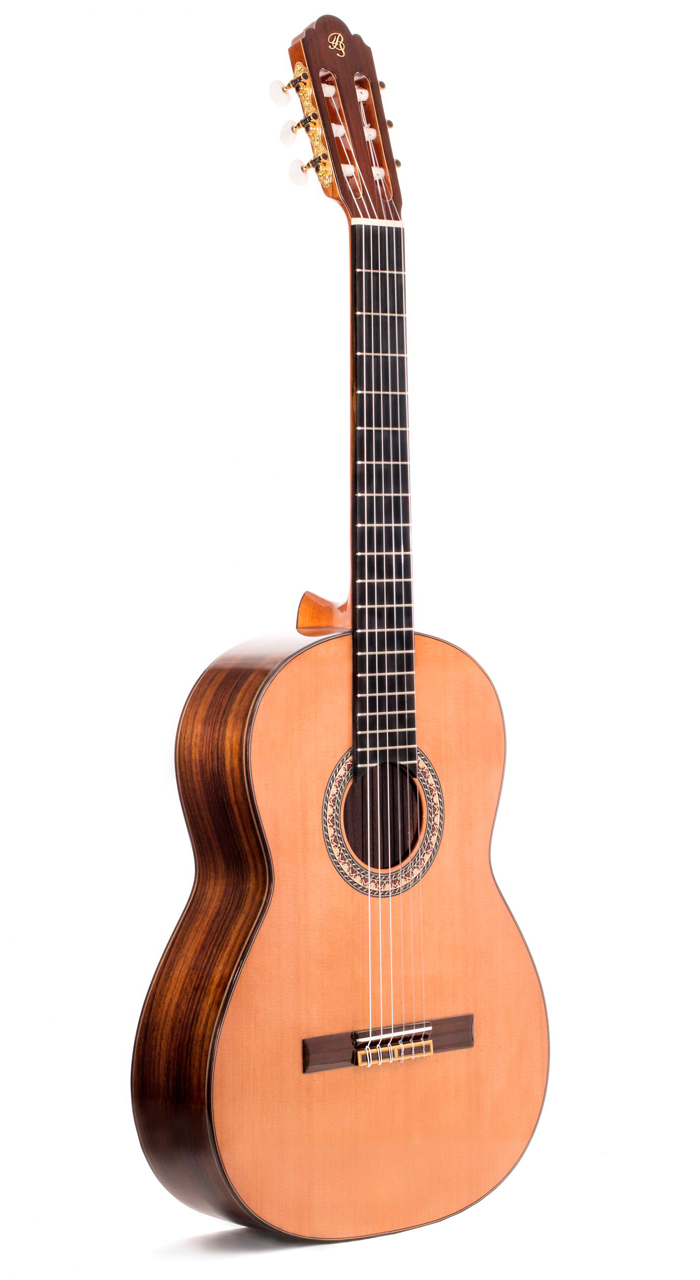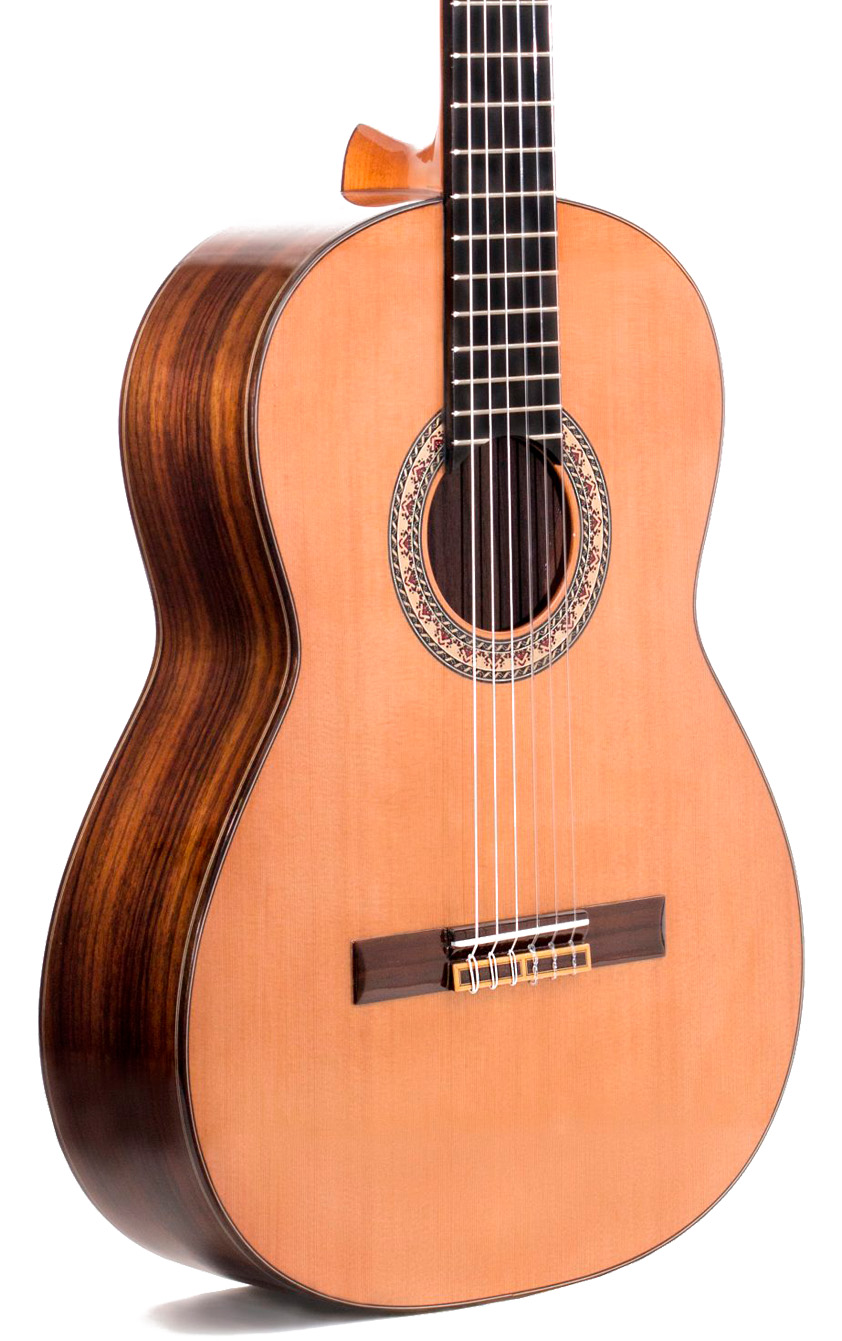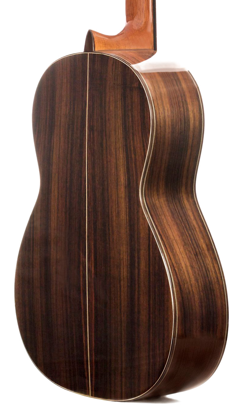 La tapa de cedro macizo aporta un sonido cálido, con graves con cuerpo y un registro medio lleno, ideal si vienes de guitarras de abeto alemán o cedro canadiense y buscas más densidad sin perder claridad. El palosanto de India macizo realza la riqueza armónica, la profundidad tonal y una acústica natural que se abre con un sustain generoso y una proyección equilibrada, controlable tanto en toque íntimo como en espacios más amplios. Es una guitarra clásica muy sensible a los matices de la mano derecha y que admite sin esfuerzo un ataque más percutivo cercano a cierta guitarra flamenca ligera, siempre con transparencia y respuesta inmediata.