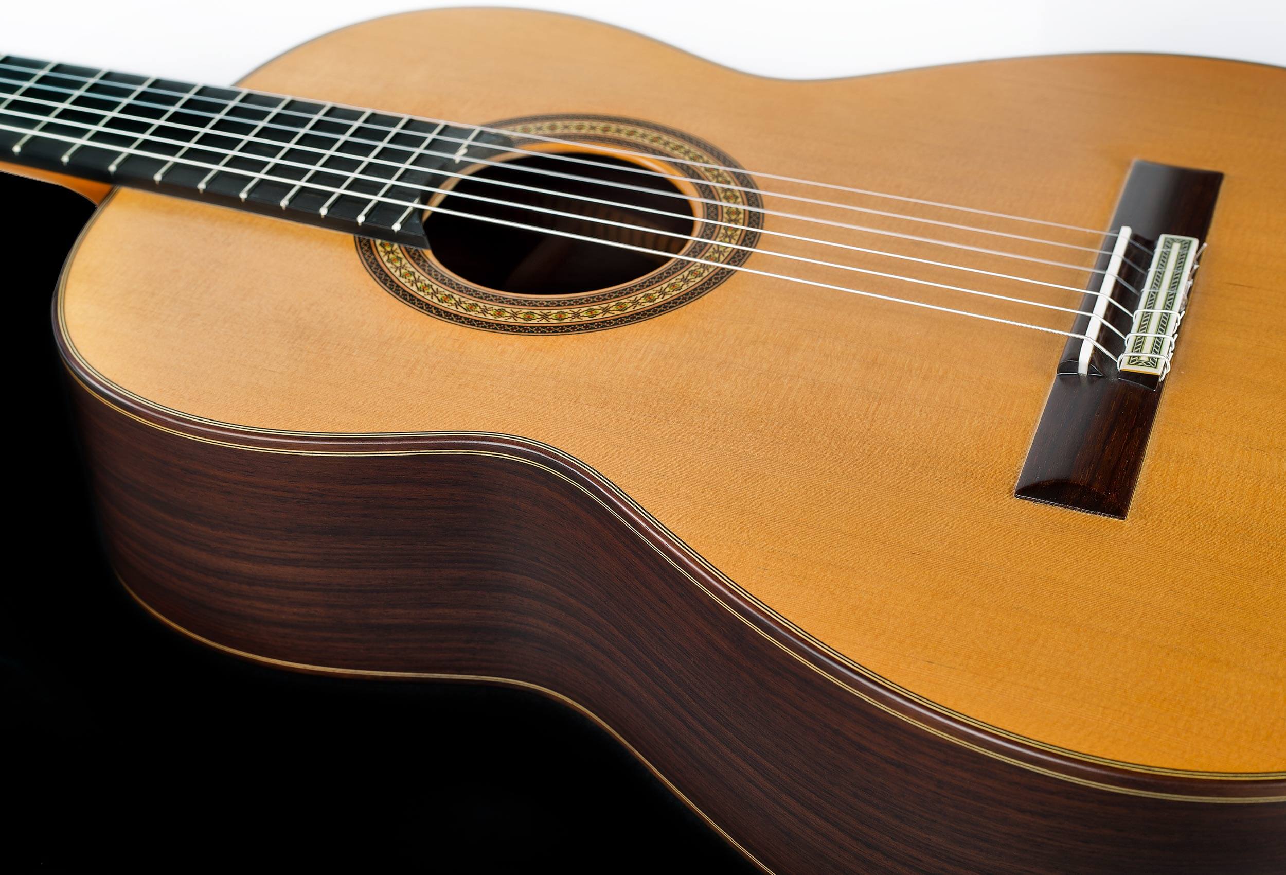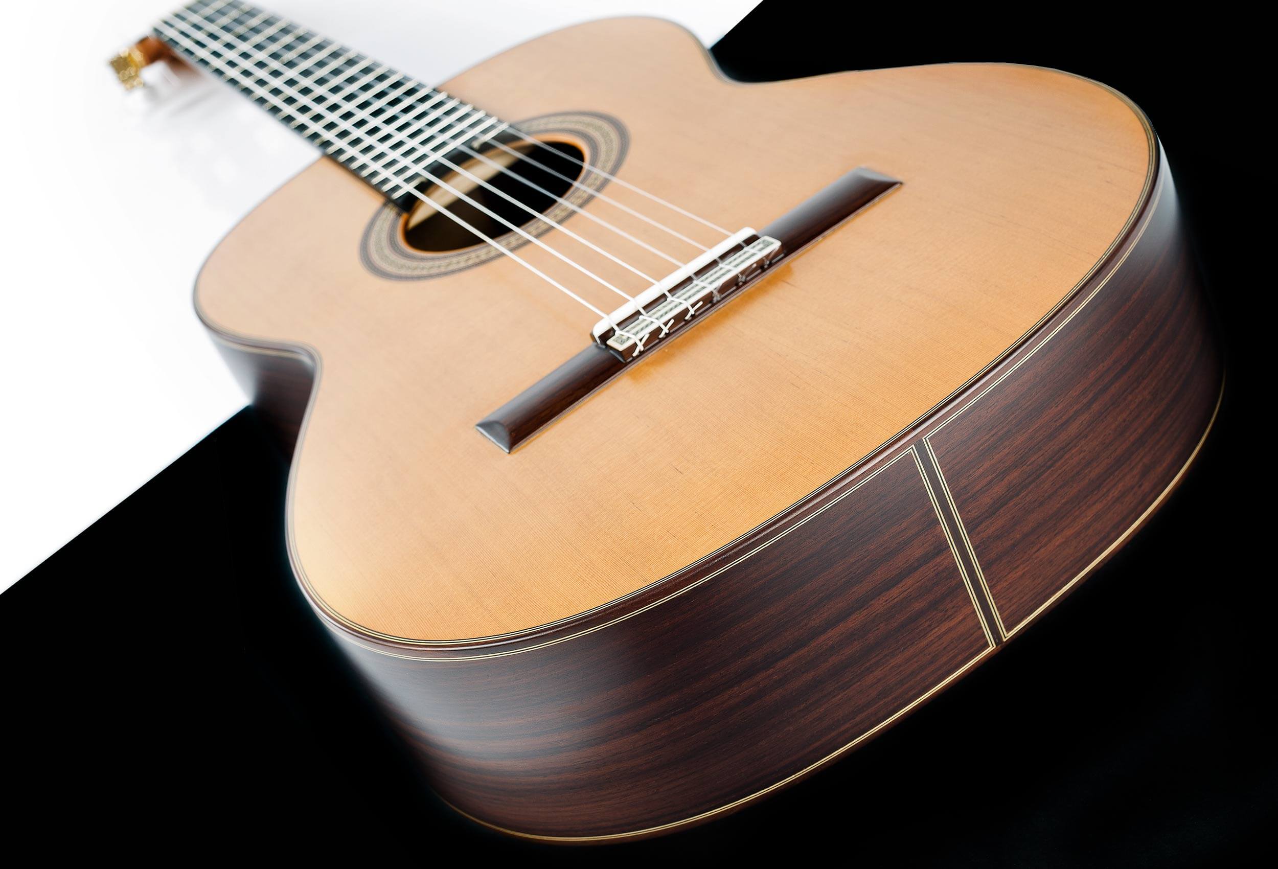 Elige abeto alemán para un timbre brillante y proyección equilibrada con riqueza armónica, o cedro canadiense para un sonido cálido y sustain profundo, donde agudos dulces y bajos texturados resuenan con transparencia acústica natural. Esta guitarra profesional hecha en España ofrece respuesta inmediata y complejidad sensorial.