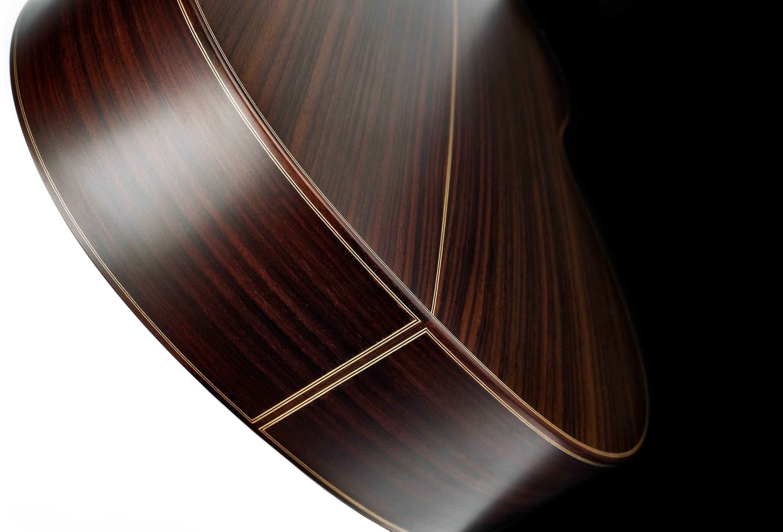 La India Estudio destaca por su tapa maciza a elegir entre abeto alemán o cedro canadiense, aros y fondo de palosanto de India macizo, diapasón de ébano africano, mástil de cedro de Brasil y puente y perfiles de palosanto de India. El acabado es poliuretánico, que protege el instrumento y realza la belleza natural de la madera.
