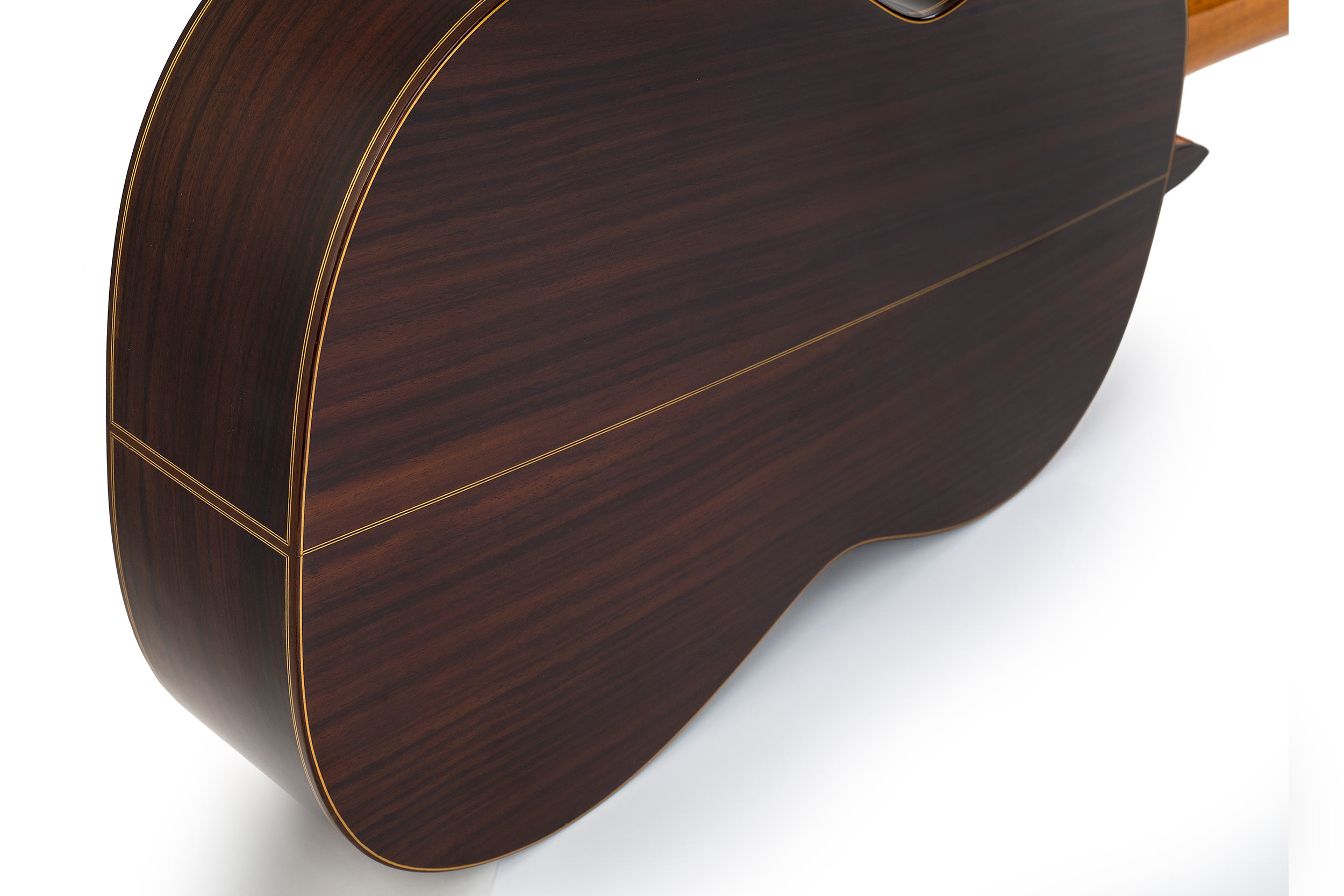 Con tapa de cedro canadiense, el timbre tiende a un sonido cálido, inmediato, con respuesta rápida al toque suave y un sustain generoso que favorece líneas melódicas y arpegios envolventes. Con abeto alemán, la guitarra ofrece mayor transparencia y proyección equilibrada, con una respuesta muy definida nota a nota, ideal para quien busca claridad en la articulación y una acústica natural que crece con los años. En ambos casos, el palosanto de India aporta profundidad tonal, graves redondos y agudos brillantes, dando un carácter de guitarra de concierto artesanal apta tanto para repertorio clásico como para explorar matices cercanos a la guitarra flamenca moderna.​