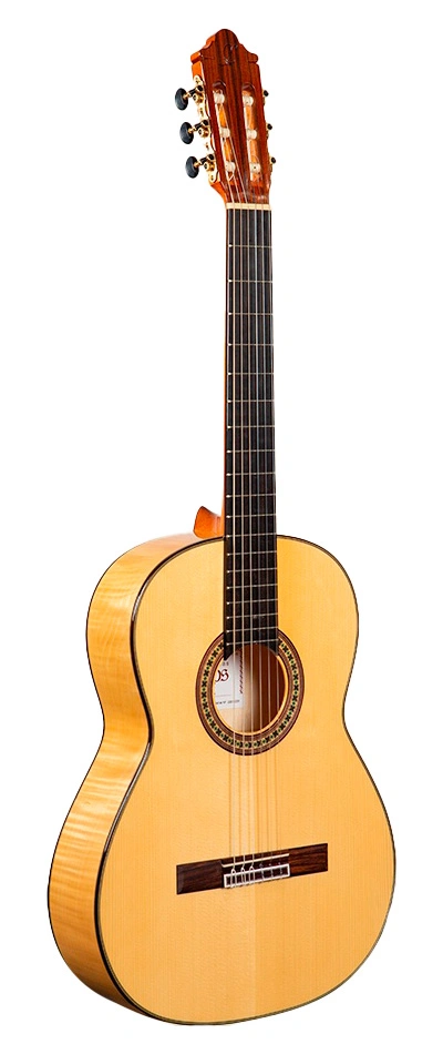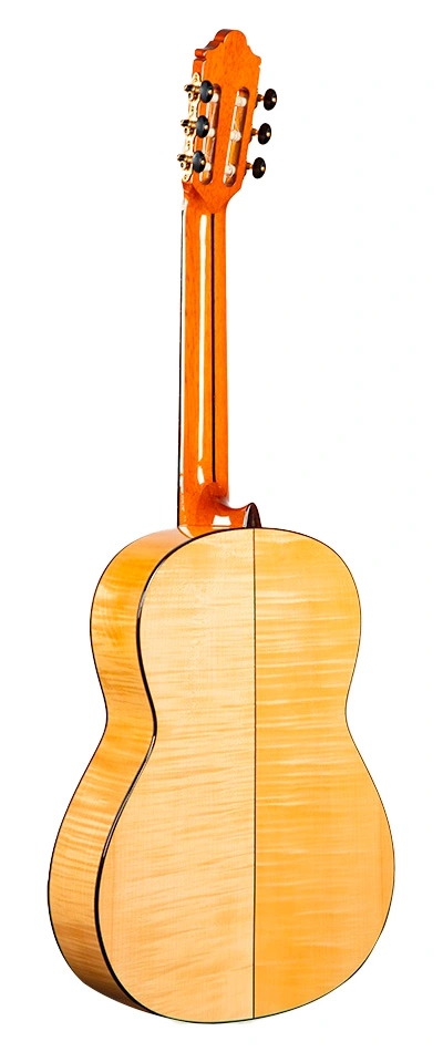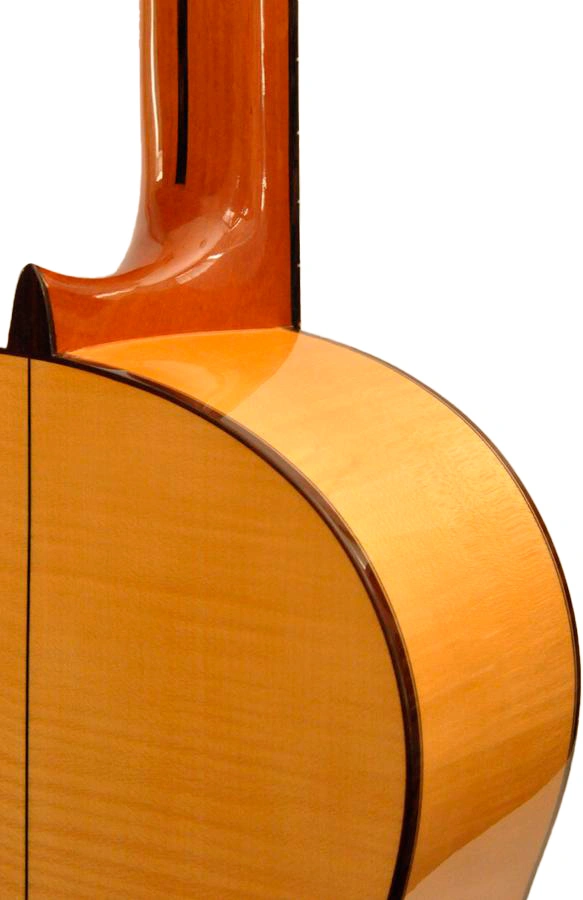 La Camps M7S es una guitarra flamenca artesanal hecha en España, con tapa maciza de abeto alemán que vibra con pureza, aros y fondo de arce rizado para ligereza y brillo, mástil de cedro real con varilla bidireccional ajustable, diapasón de ébano, puente de palisandro y barniz de poliuretano brillante. Escala de 650 mm, cejuela de 52 mm y profundidad de caja de 90 mm en tacón y fondo aseguran comodidad táctil y respuesta inmediata.
