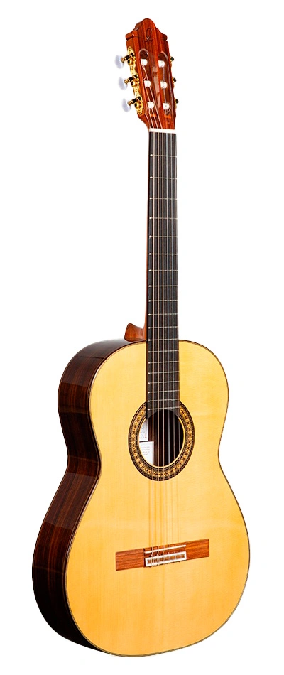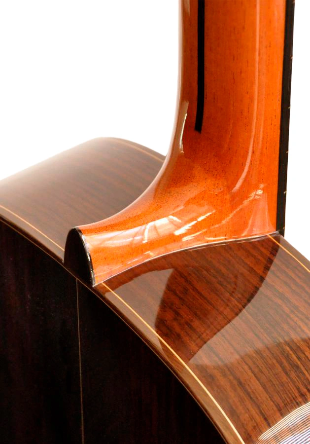 La Camps PRIMERA NEGRA destaca por su tapa de abeto macizo alemán, aros y fondo de palosanto de India macizo, mástil de cedro con refuerzo de fibra de carbono, diapasón de ébano y puente de palisandro , y cejuelas de hueso. Escala de 650 mm, cejilla de 52 mm y profundidad de caja entre 85-90 mm aseguran ergonomía impecable. El acabado brillante en poliuretano resalta su ligereza (alrededor de 1450 g) y artesanía profesional.