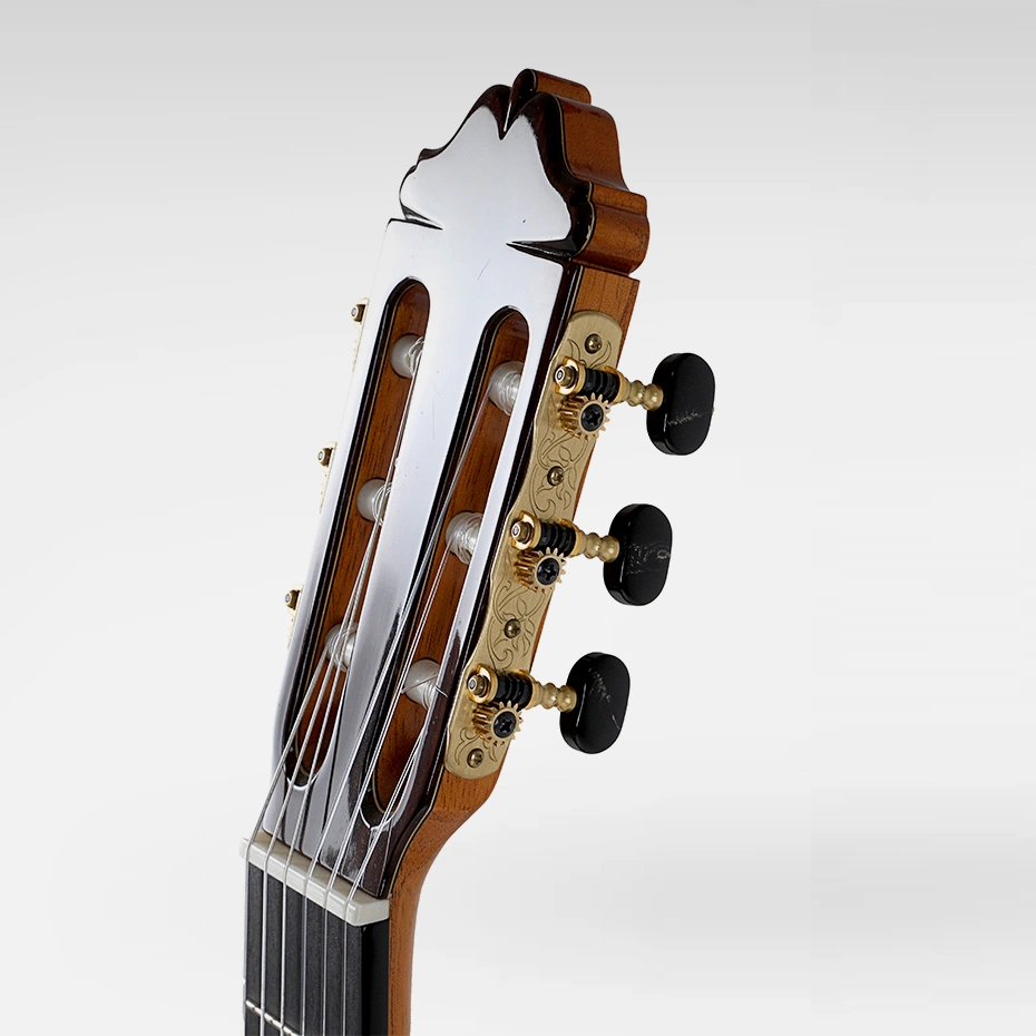 El resultado es una guitarra flamenca con un sonido cálido, pero con suficiente claridad para que el compás y los golpes de uña se perciban con nitidez. Los bajos son definidos y profundos, mientras que los agudos conservan una textura nítida, sin sonar metálicos, lo que permite una proyección equilibrada incluso en espacios reducidos. La respuesta es inmediata: la tabla reacciona con transparencia al ataque, ofreciendo una resonancia armónica rica y un sustain generoso, ideal para quien disfruta de la interacción con el propio sonido más que con efectos externos.