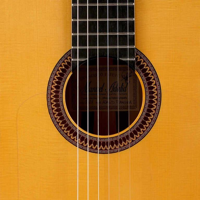 La Adalid Flamenca Negra monta una tapa de abeto alemán macizo sobre un cuerpo de palosanto de India macizo en fondo y aros, combinación que aporta estabilidad y un núcleo armónico denso. El mástil en cedro con refuerzo de fibra de carbono y diapasón en ébano garantiza ligereza, estabilidad en el tiro y una respuesta muy precisa a la presión de la mano izquierda. El instrumento se acaba con laca en nitrocelulosa, propio de las guitarras de concierto artesanales hechas en España, realzando la resonancia sin encorsetar la tabla.