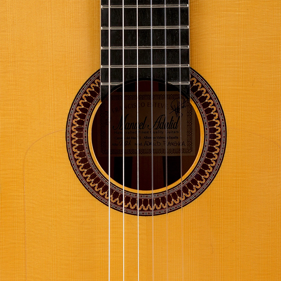 La Adalid Flamenca Negra de Esteve es un ejemplo de lo que ocurre cuando la tradición de la guitarra española se cruza con la exigencia de un luthier contemporáneo. Fabricada bajo la supervisión del maestro Manuel Adalid en Valencia, esta guitarra flamenca reúne la sensibilidad de un instrumento de estudio y la resistencia de una flamenca de trabajo diario, pensada para quienes buscan una guitarra profesional con acústica natural y carácter definido, sin necesidad de amplificación.