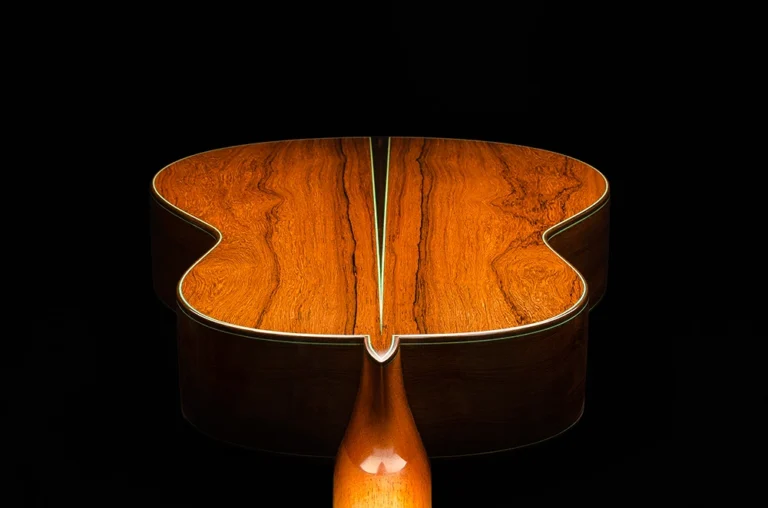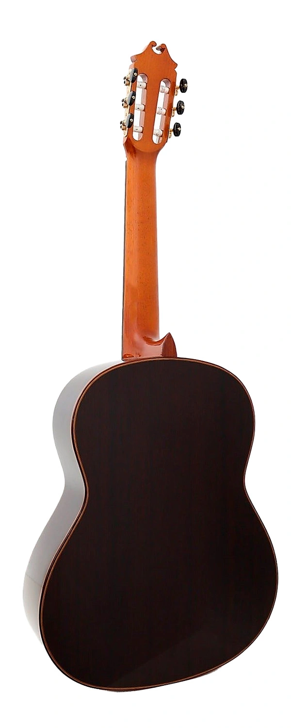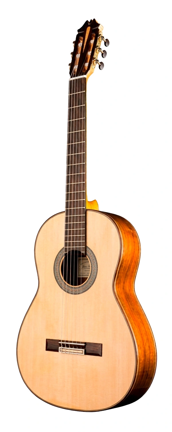 La tapa de abeto alemán (Picea abies) ofrece una vibración pura y selecta, combinada con aros y fondo de palosanto de India (Dalbergia latifolia) para una resonancia profunda y cálida. El mástil de cedro asegura ergonomía impecable, con diapasón de ébano que favorece la agilidad, escala de 650 mm y cejuela de 51,7 mm para una mano izquierda cómoda. Barnizada en laca nitrocelulósica natural, resalta su acústica natural y artesanía hecha en España.