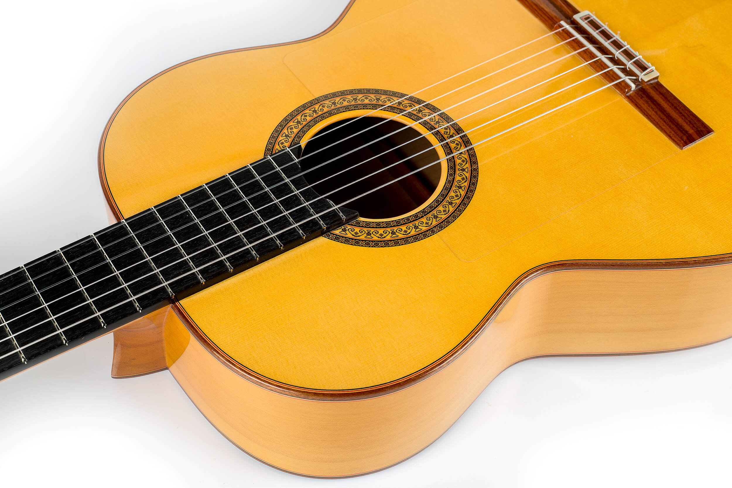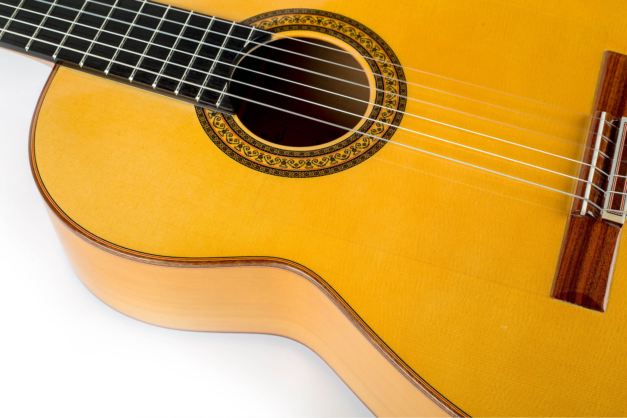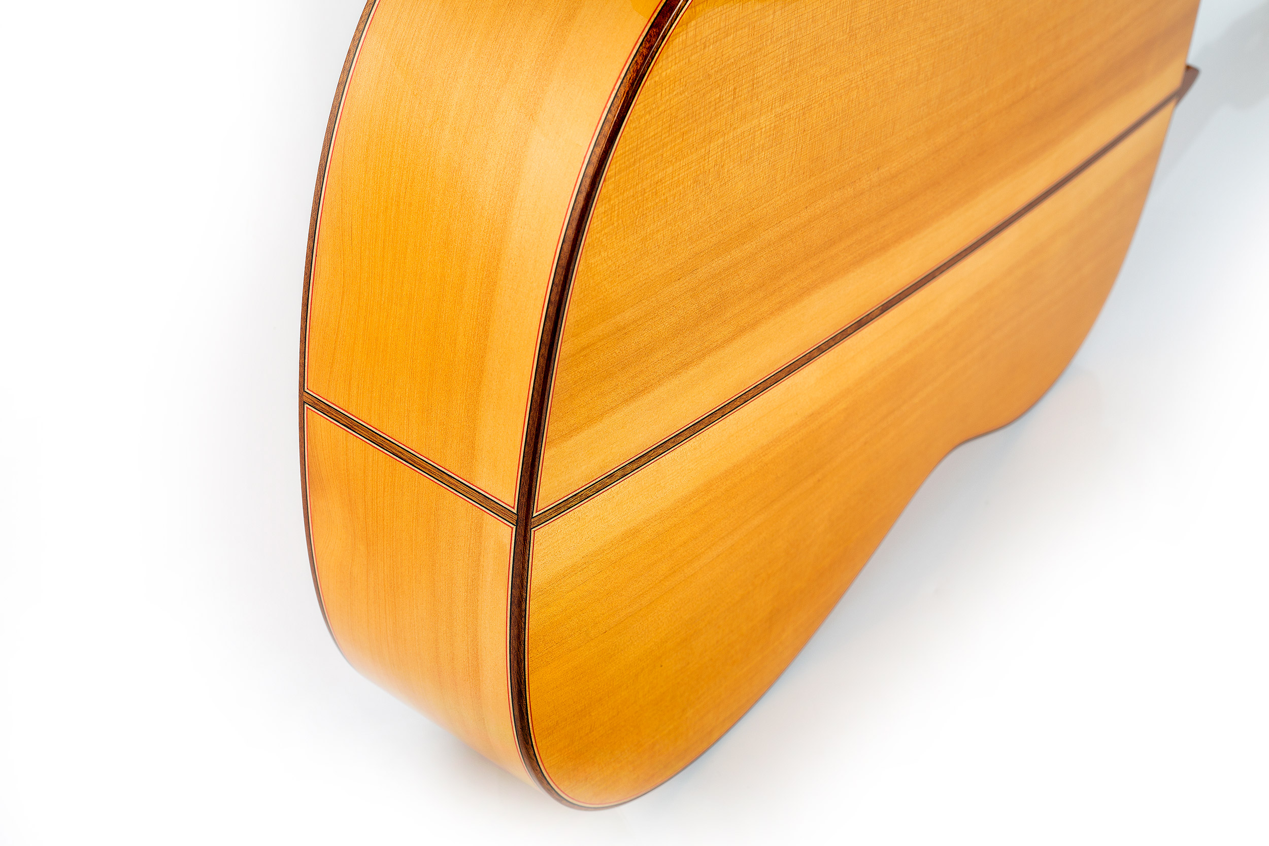 La tapa puede realizarse en abeto alemán o cedro canadiense, aros y fondo son de ciprés muy selecto, elegido por su ligereza y capacidad para entregar un sonido brillante y con gran proyección. El mástil de cedro brasileño y diapasón de ébano africano ofrecen una ergonomía perfecta para la interpretación exigente, mientras el barniz de laca de nitrocelulosa protege y realza el instrumento sin comprometer su acústica natural.